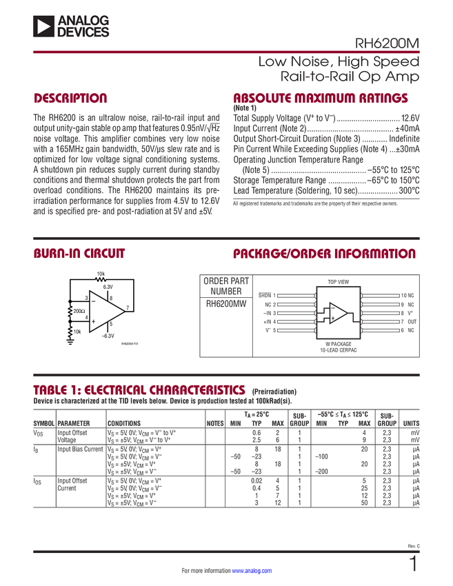 RH6200M Low Noise, High Speed Rail-to-Rail Op Amp