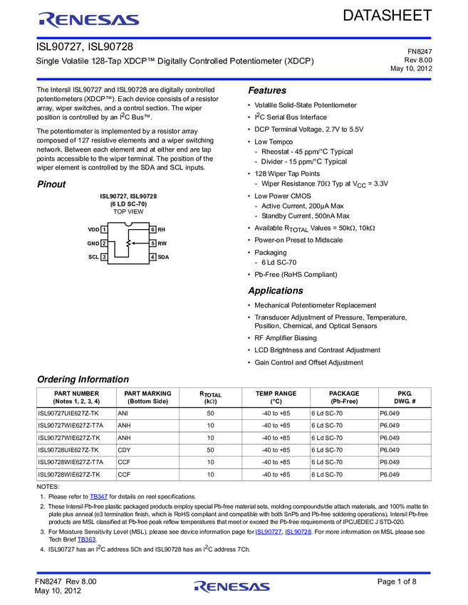 ISL90727UIE627Z-TK, ISL90727WIE627Z, ISL90727WIE627Z-T7A, ISL90727WIE627Z-TK