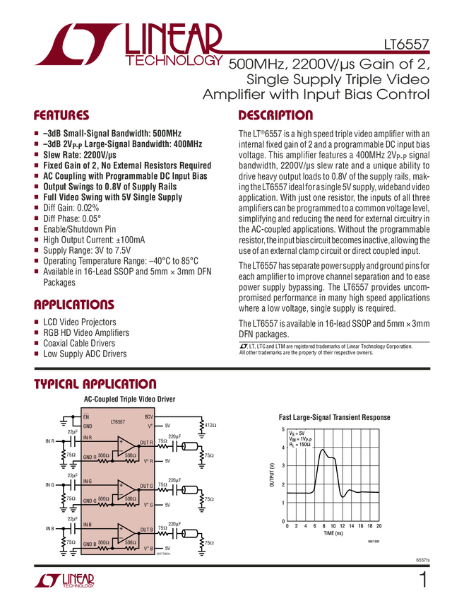 LT6557 500MHz, 2200V/µs Gain of 2, Single Supply Triple Video Amplifier with Input...