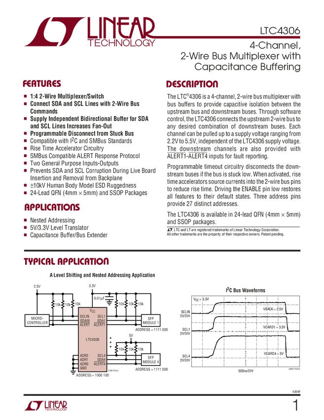 LTC4306 4-Channel, 2-Wire Bus Multiplexer with Capacitance Buffering
