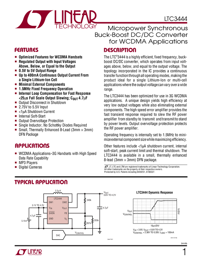 LTC3444 Micropower Synchronous Buck-Boost DC/DC Converter for WCDMA Applications