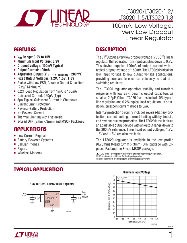 LT3020 100mA, Low Voltage, Very Low Dropout Linear Regulators