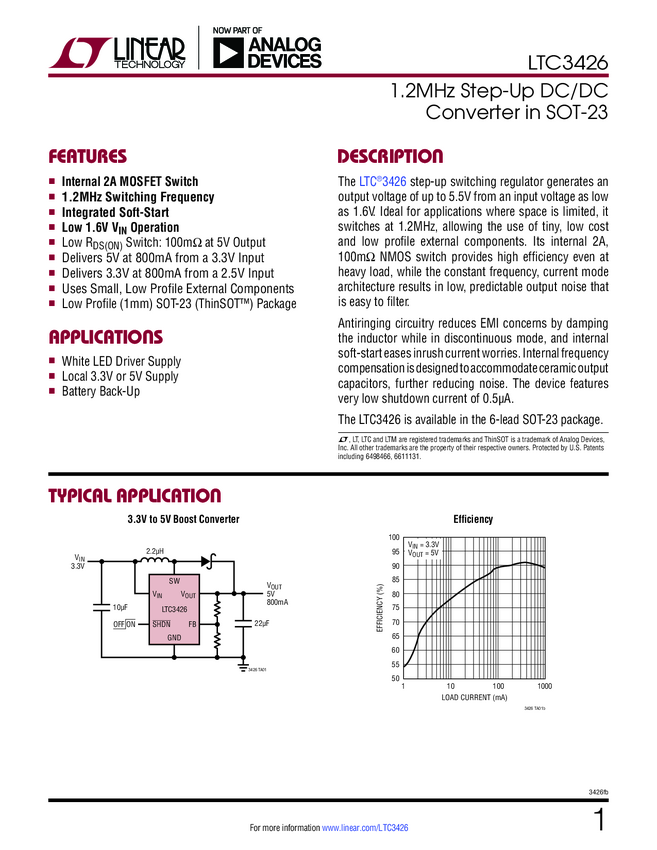 LTC3426 1.2MHz Step-Up DC/DC Converter in SOT-23