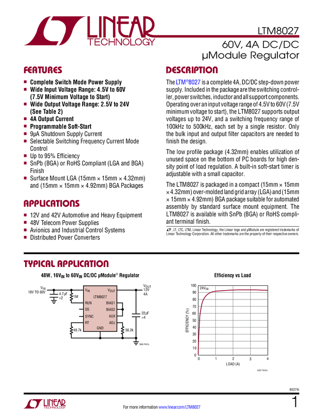 LTM8027 60V, 4A DC/DC μModule (Power Module) Regulator