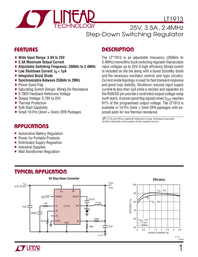 LT1913 25V, 3.5A, 2.4MHz Step-Down Switching Regulator