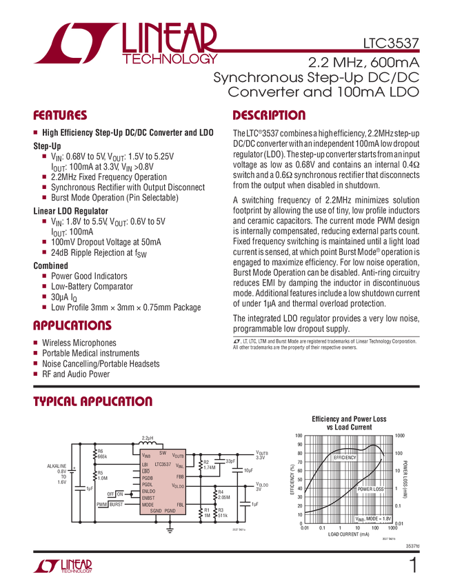 LTC3537 2.2 MHz, 600mA Synchronous Step-Up DC/DC Converter and 100mA LDO