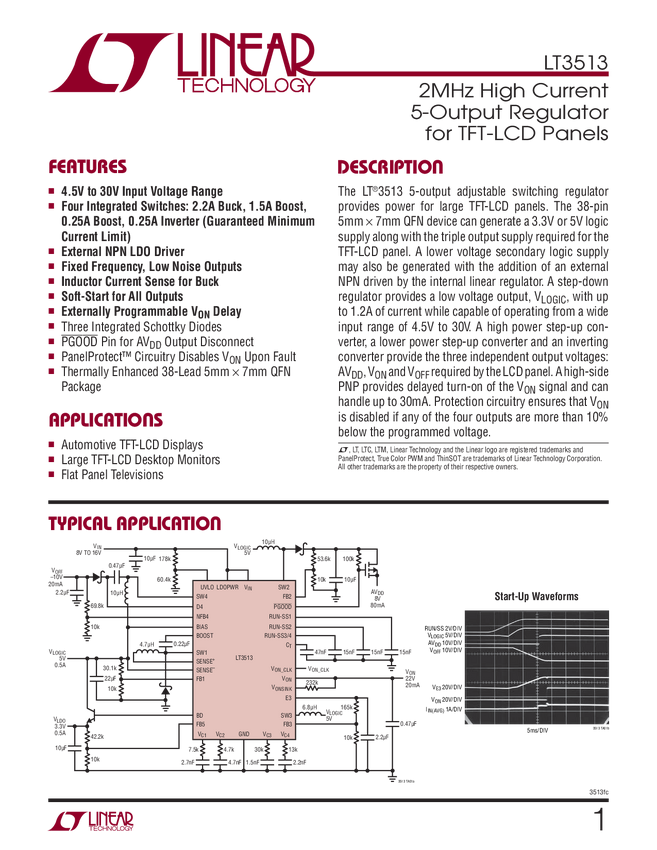 LT3513 2MHz High Current 5-Output Regulator for TFT-LCD Panels