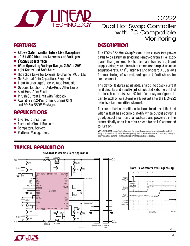 LTC4222 Dual Hot Swap Controller with IC Compatible Monitoring