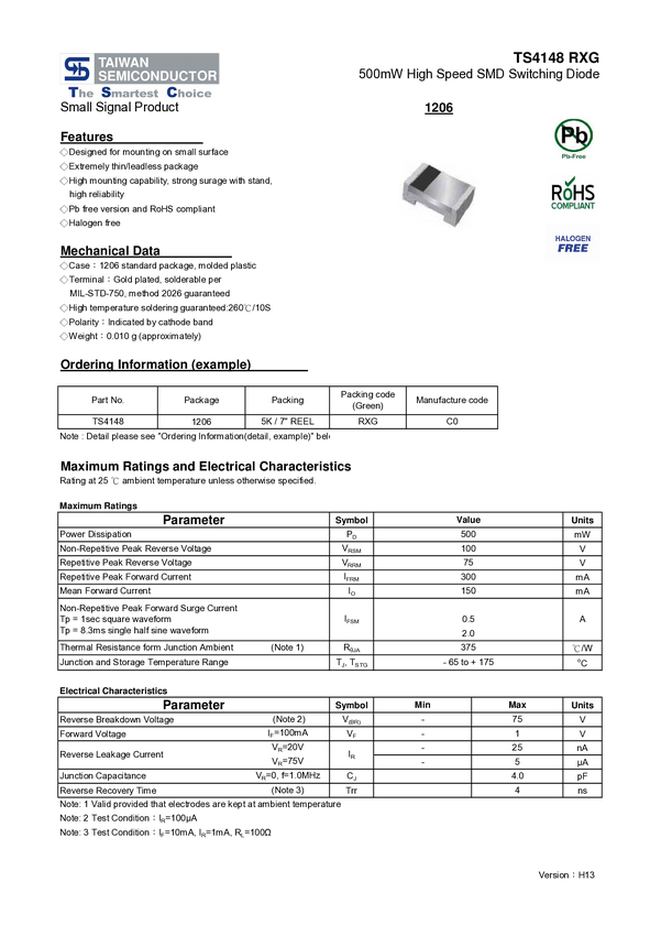 Dioda; TS4148RXG; przełączająca; 150mA; 75V; 1206; SMD; TAI-SEM; 1N4148-1206; RoHS; op/100szt