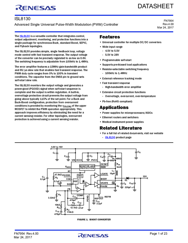 ISL8130 Advanced Single Universal Pulse-Width Modulation (PWM) Controller