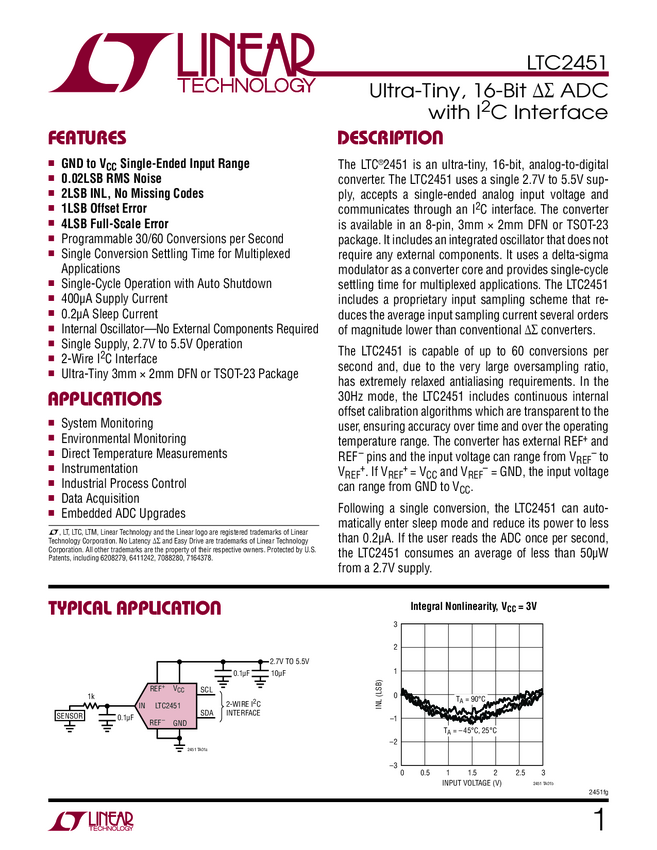 LTC2451 Ultra-Tiny, 16-Bit ΔΣ ADC with IC Interface