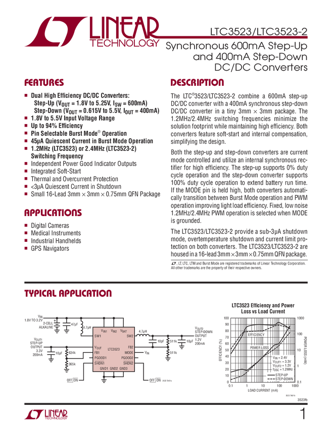 LTC3523 Synchronous 600mA Step-Up and 400mA Step-Down DC/DC Converters