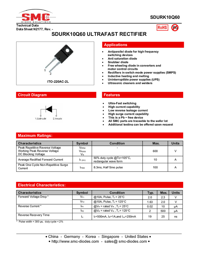 SDURK10Q60 Dioda; prostownicza; SDURK10Q60; 10; 600V; 25ns; TO220FP-2; THT; SMC; RoHS
