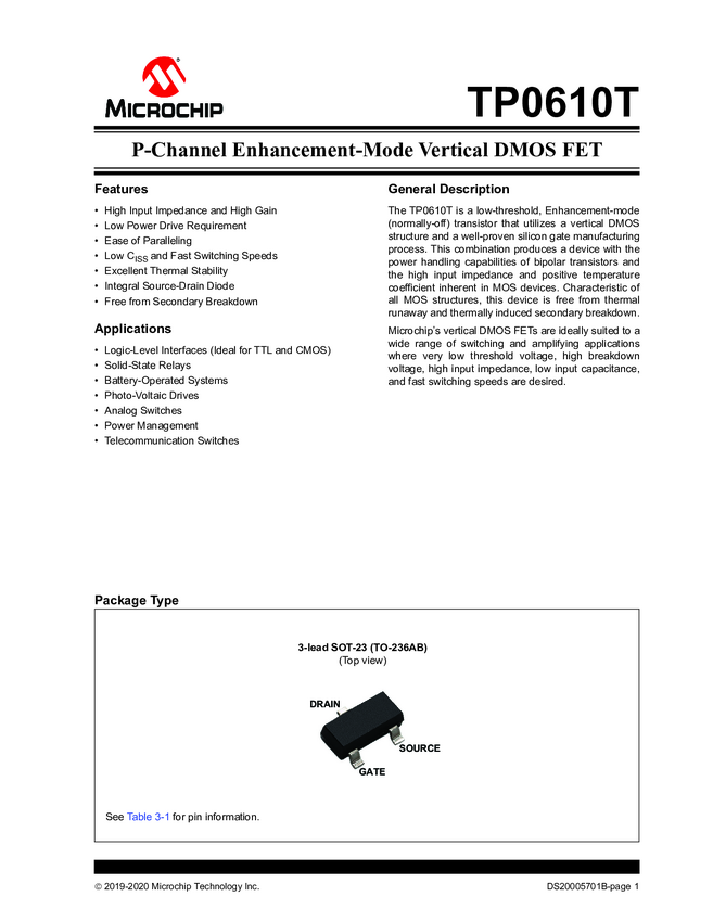 TP0610T P-Channel Enhancement-Mode Vertical DMOS FET Data Sheet