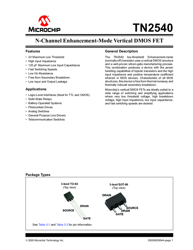 TN2540 N-Channel Enhancement-Mode Vertical DMOS FET Data Sheet