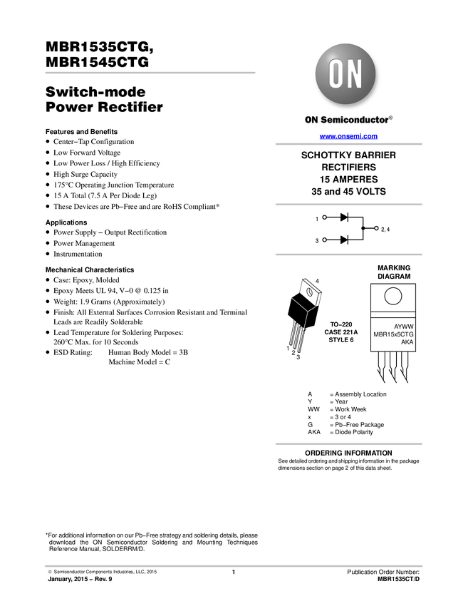 Dioda; prostownicza; Schottky; MBR1545CTG; 15A; 45V; 1,15-1,39mm; TO220; THT; RoHS