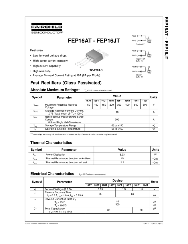 FEP16CT Dioda; prostownicza; FEP16CT; 16A; 150V; 35ns; TO220; THT; RoHS