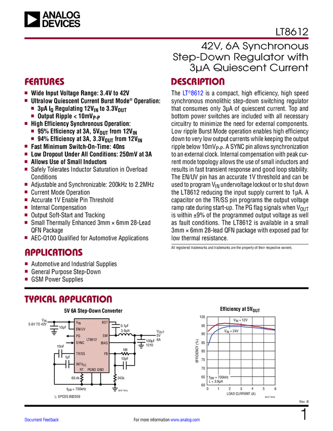 LT8612 42V, 6A Synchronous Step-Down Regulator with 3μA Quiescent Current