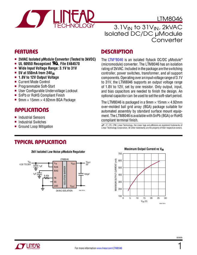 LTM8046 3.1V to 31V, 2kVAC Isolated DC/DC μModule (Power Module) Converter