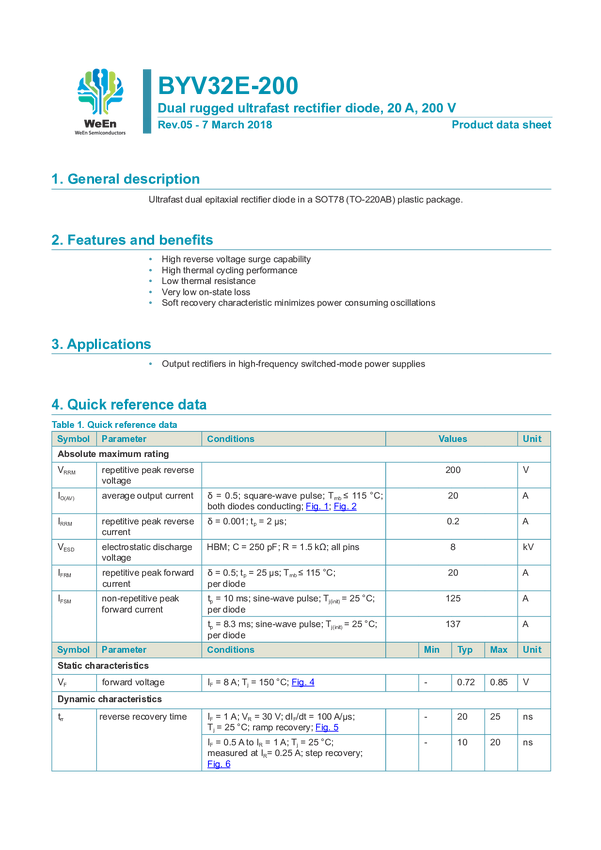 Dioda; prostownicza; BYV32E-200; 20A; 200V; 25ns; TO220; THT; NXP; RoHS