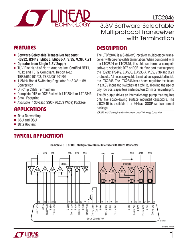 LTC2846 3.3V Software-Selectable Multiprotocol Transceiver with Termination