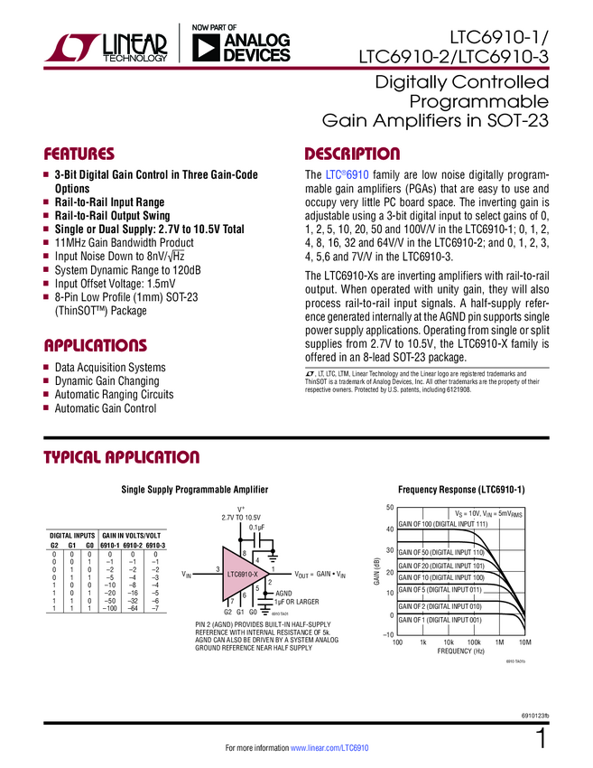 LTC6910 Digitally Controlled Programmable Gain Amplifiers in SOT-23