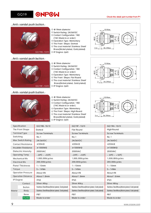 Przełącznik; przyciskowy; reset; GQ19B-10/S; OFF-(ON); 1 tor; srebrny; wypukły; śrubowe; 2A; 36V AC; 19mm; IP65; Fi-19mm; ONPOW; RoHS