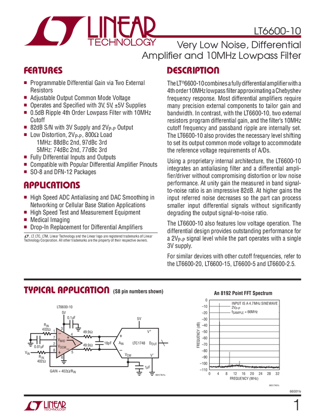 LT6600-10 Very Low Noise, Differential Amplifier and 10MHz Lowpass Filter