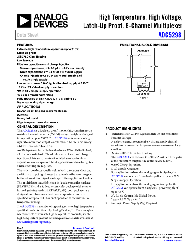 ADG5298 High Temperature (up to 210°C), High Voltage, Latch-Up Proof, 8-Channel Mul...