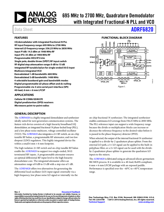 ADRF6820 695 MH to 2700 MH Quadrature Demodulator with Integrated Fractional-N PLL a...
