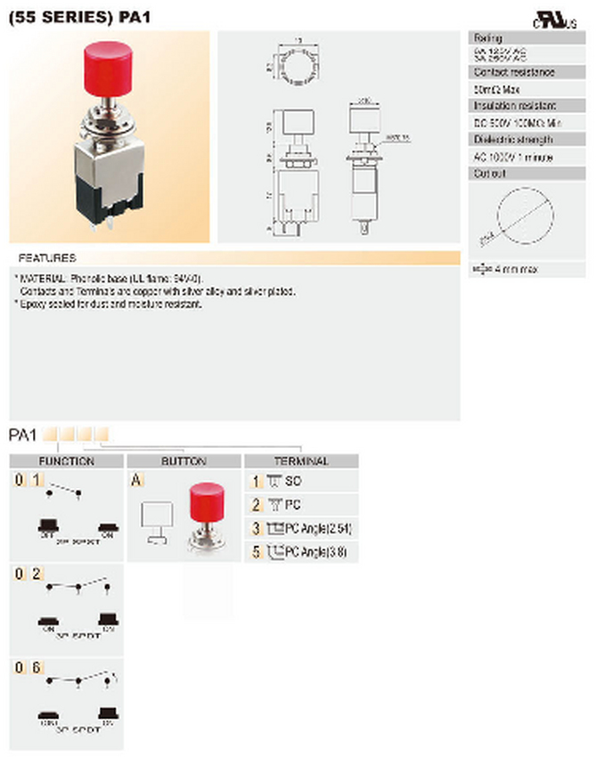 Przełącznik; przyciskowy; ON-ON; 2 pozycje; SPDT; 3A; 250V AC: czerwony; fi 6,2mm; PA102A1; SCI; RoHS