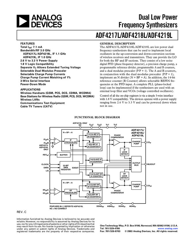 ADF4219L Low Power dual RF/IF Integer-N PLL