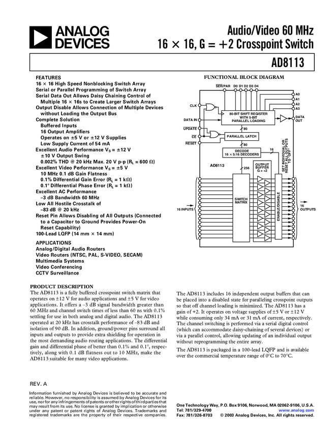 AD8113 Audio/Video 60MHz 16 x 16 Crosspoint Switch