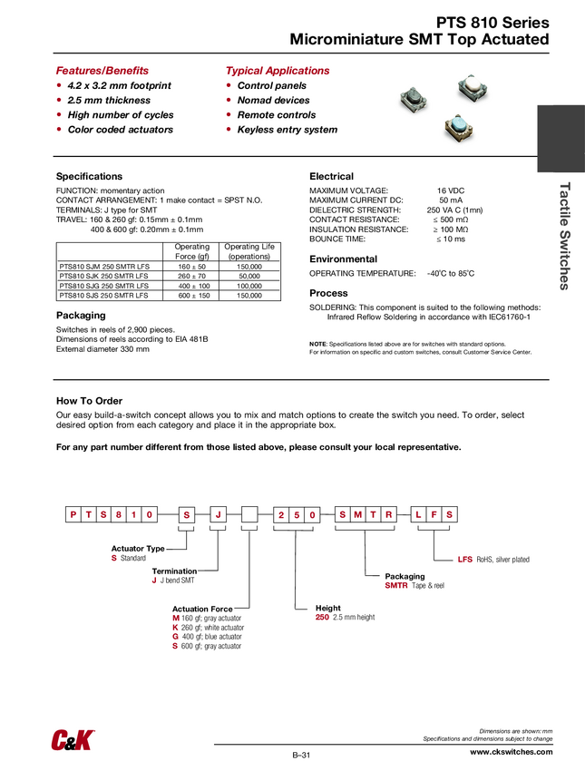 PTS810SJS250SMTR, PTS810SJK250SMTRLF, PTS810SJG250SMTRLF