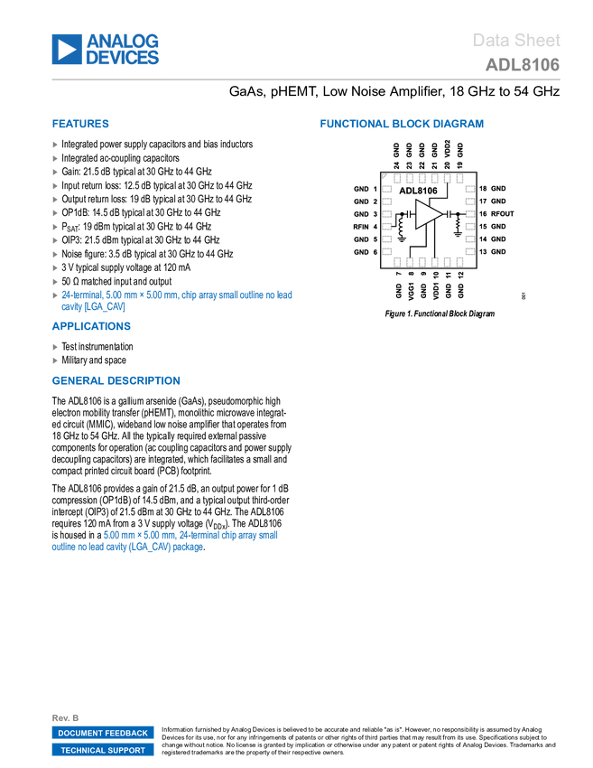 ADL8106 GaAs, pHEMT, Low Noise Amplifier, 20 GHz to 54 GHz