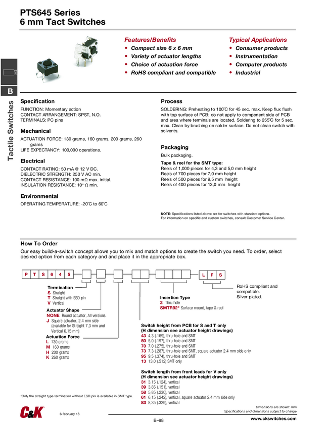 Mikroprzycisk; 6x6mm; 8,3mm; PTS645VK83-2; 6mm; THT; kątowy; 2 piny; czerwony; OFF-(ON); 50mA; 12V DC; 2,6N; C&K; RoHS