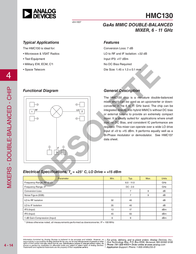 HMC130 GaAs MMIC DBL-BAL Mixer Chip, 6 - 11 GHz