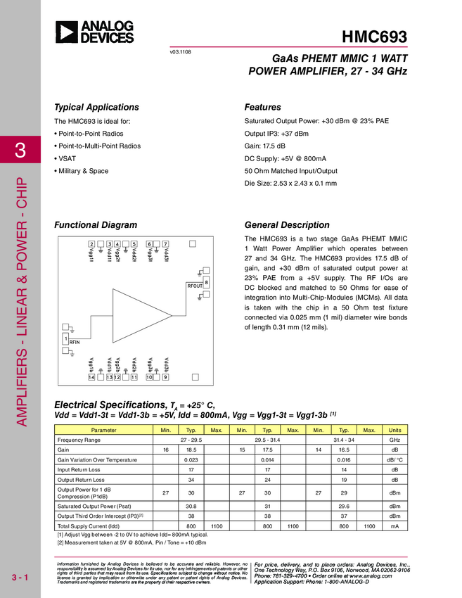 HMC693 1 Watt Power Amplifier Chip, 27 - 34 GHz