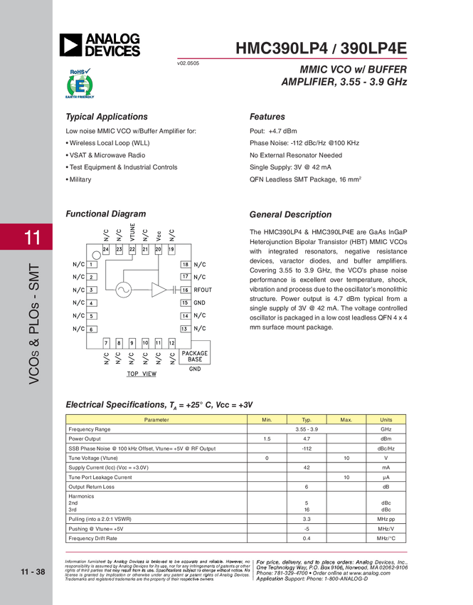 HMC390 VCO SMT w/Buffer Amplifier, 3.55 - 3.9 GHz