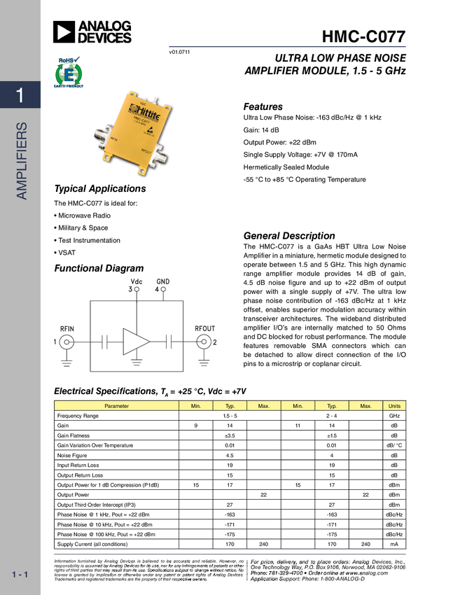HMC-C077 Ultra Low Phase Noise Amplifier Module, 1.5 - 5 GHz