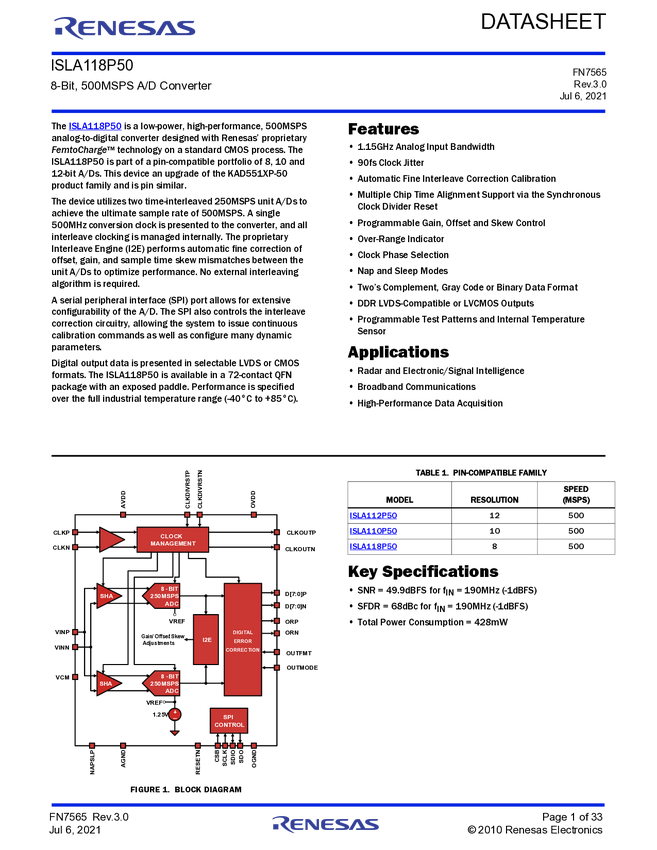 ISLA118P50 8-Bit, 500MSPS A/D Converter