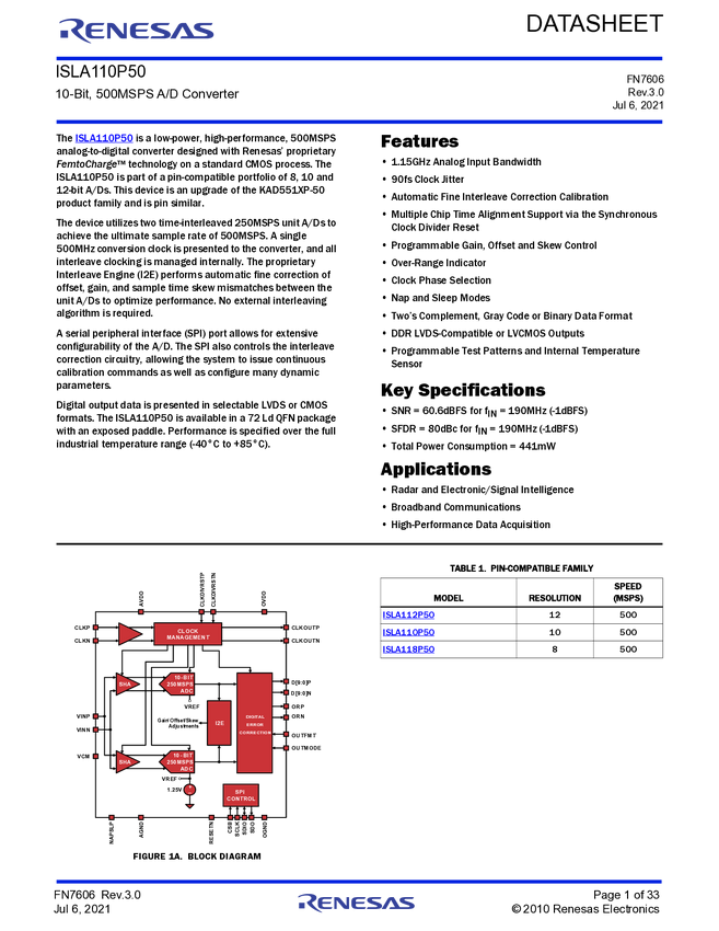 ISLA110P50 10-Bit, 500MSPS A/D Converter