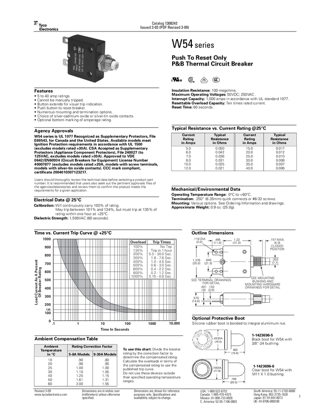 W54-XB1A4A10-30 Wyłącznik nadprądowy; 250V AC; 50V DC; 30A; SPST-NC; TE CONNECTIVITY; W54-X...