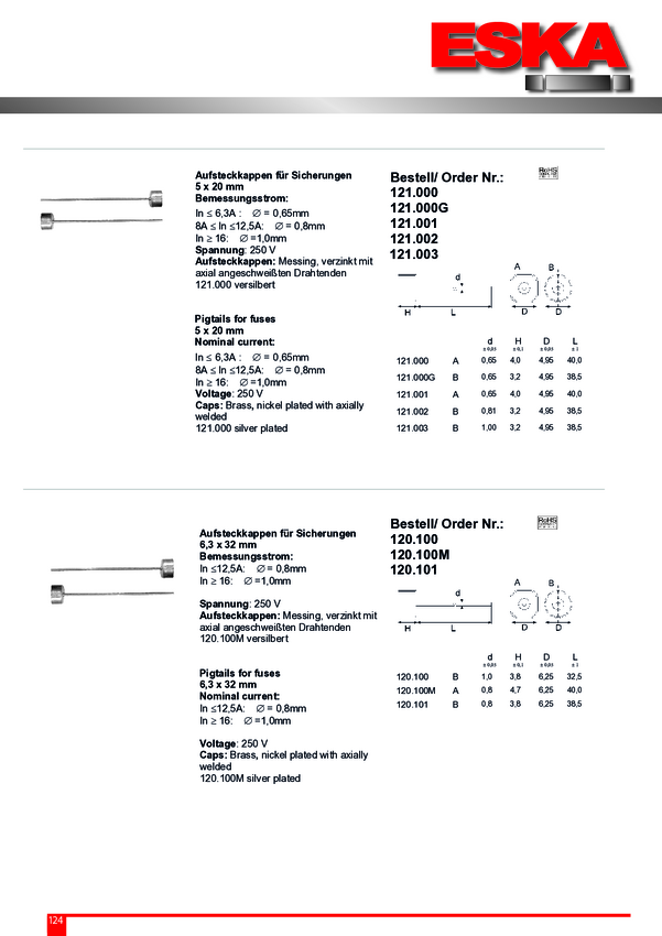 Gniazdo; bezpieczniki rurkowe; 6,3A; 250V; srebrzony; 5x20mm; PCB; osiowe; ESKA; 121.000G; zamawiasz: parę (2x5=10 sztuk "cena widoczna za parę"); RoHS