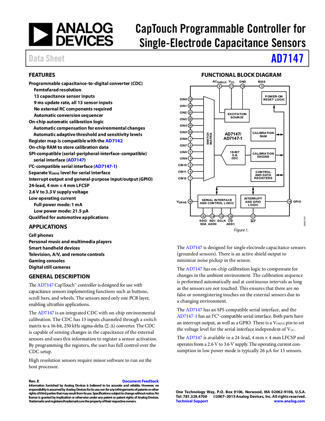AD7147 CapTouch Programmable Controller for Single-Electrode Capacitance Sensors