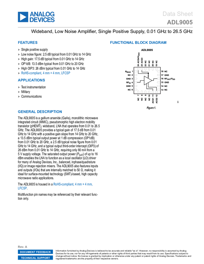 ADL9005 Wideband, Low Noise Amplifier, Single Positive Supply, 0.01 GHz to 26.5 GHz