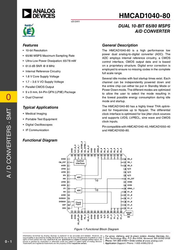 HMCAD1040-80 Dual 10-Bit 65 to 80 MSPS A/D Converter