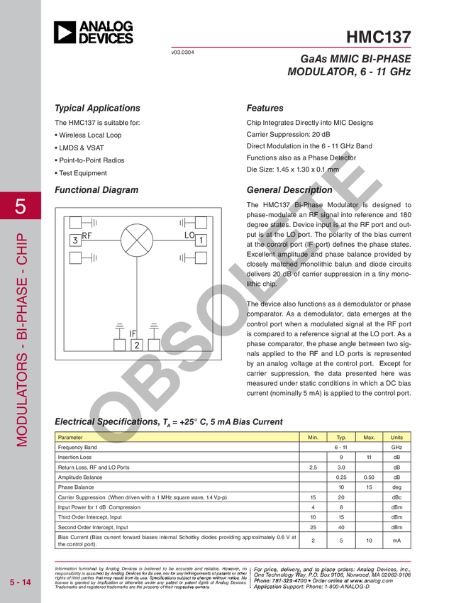 HMC137 GaAs MMIC Bi-Phase Modulator Chip, 6 - 11 GHz