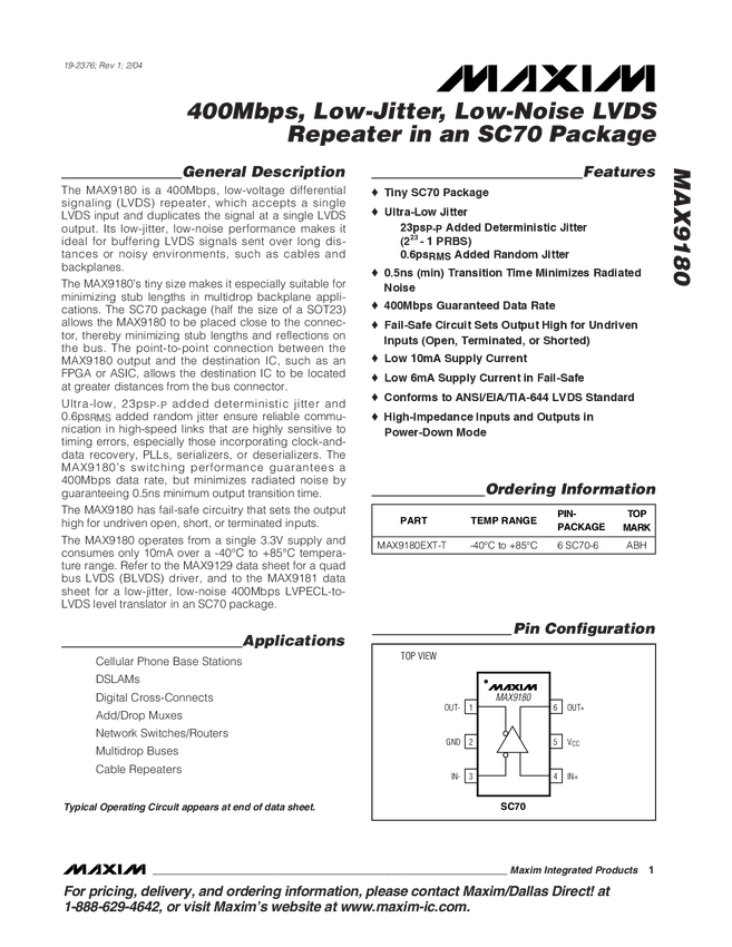 MAX9180 400Mbps, Low-Jitter, Low-Noise LVDS Repeater in an SC70 Package