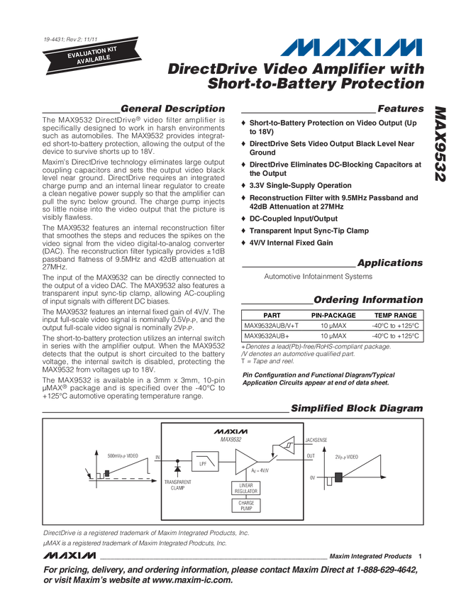 MAX9532 DirectDrive Video Amplifier with Short-to-Battery Protection